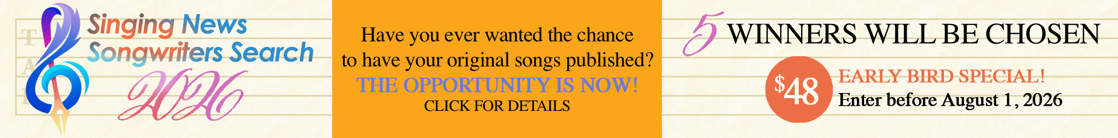 Singing News Launches 2026 Songwriters Search for Aspiring Southern Gospel Writers Jill Carothers April 6, 2026 HENDERSONVILLE, TN — Singing News is now accepting entries for the 2026 Singing News Songwriters Search, offering non-...